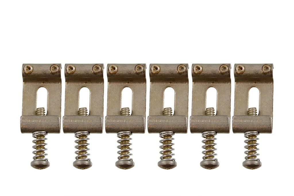 Bridge saddles (set of 6) vintage style for Strat®, springs/screws, 2-3/16″ spacing. For USA made Strats.