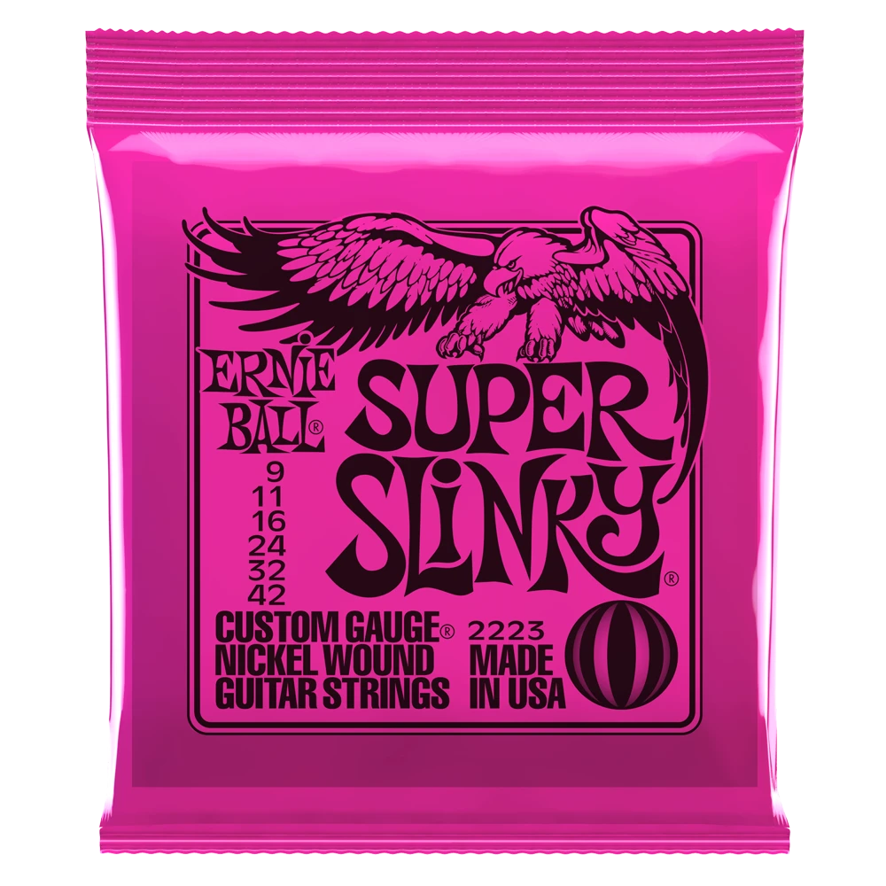 Ernie Ball Super Slinky Electric Strings are played by Jimmy Page, Jeff Beck, and Angus Young.