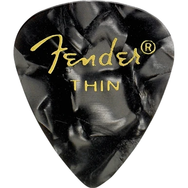 Fender 351 Thin Black Moto Pick Pack. Comes as a pack of 12 picks. Celluloid is a premier pick material and the cornerstone of the Fender pick collection for decades. Celluloid picks give the traditional feel and a warm, round musical tone. The traditional 351 shape, our most popular pick design, is a perfect accessory for players of versatile styles and techniques.